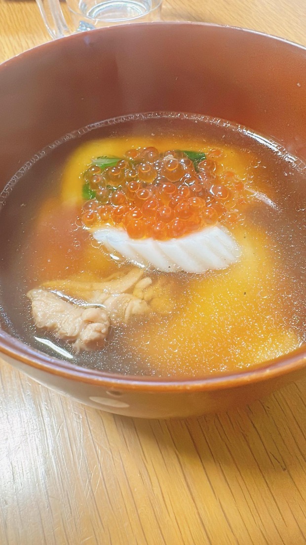 俺実家の雑煮「角餅、醤油味、鶏肉、なると、ほうれん草、いくらを添える」