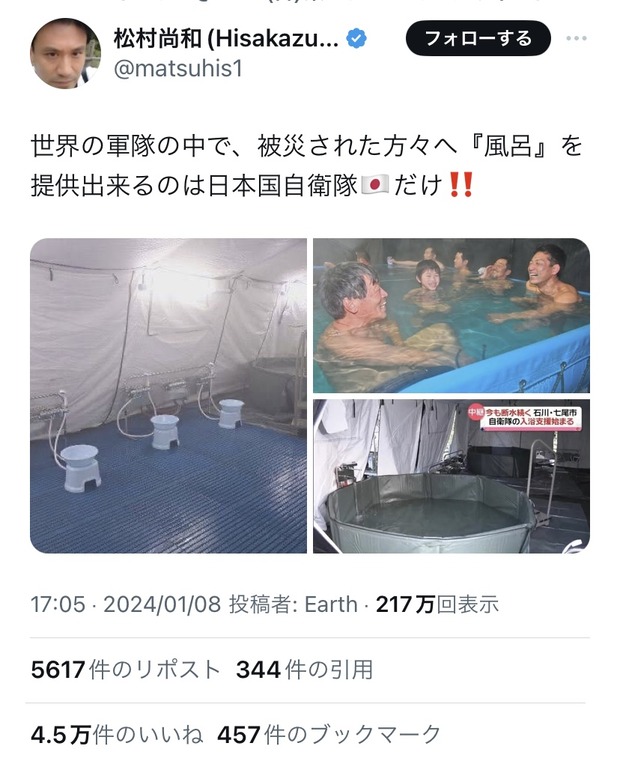 日本人「世界の軍隊で『風呂』を提供出来るのは自衛隊だけ」→4.6万いいね わざわざ風呂入りたいか?