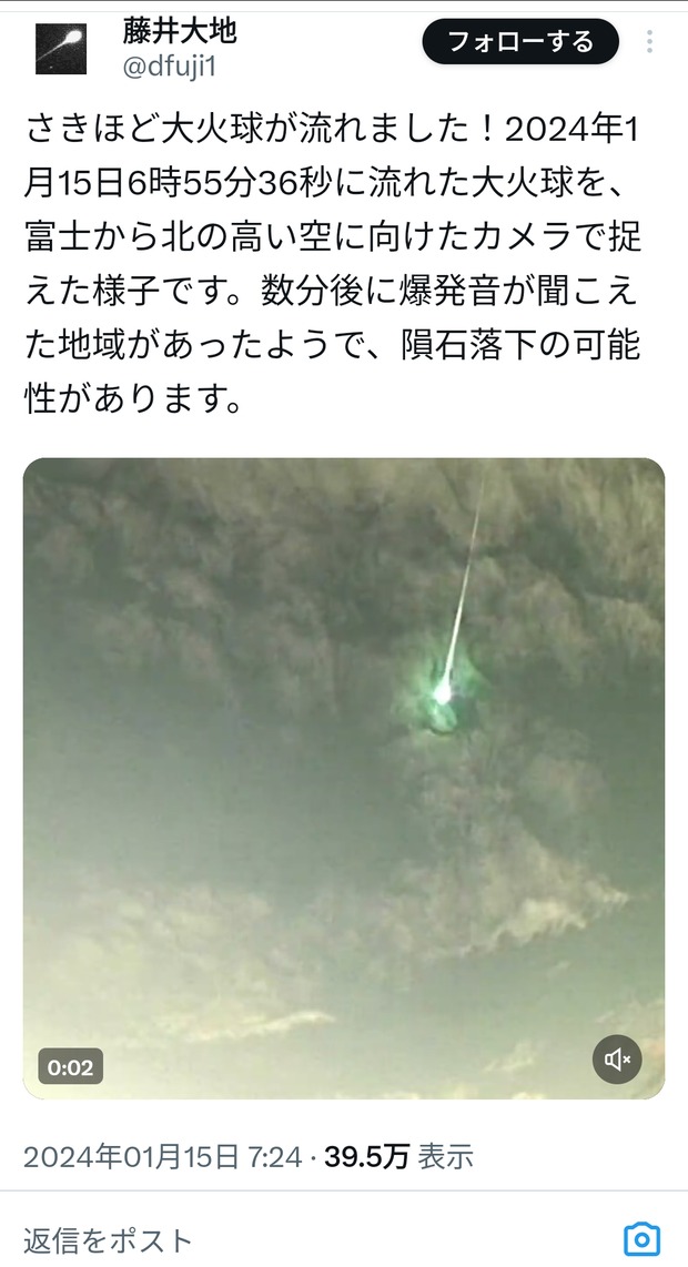 さきほど大火球が流れました!2024年1月15日6時55分36秒に流れた大火球を、富士から北の高い空に向けたカメラで捉えた様子です。数分後に爆発音が聞こえた地域があったようで、隕石落下の可能性があります。 pic.twitter.com/6DL7h3Kybm
