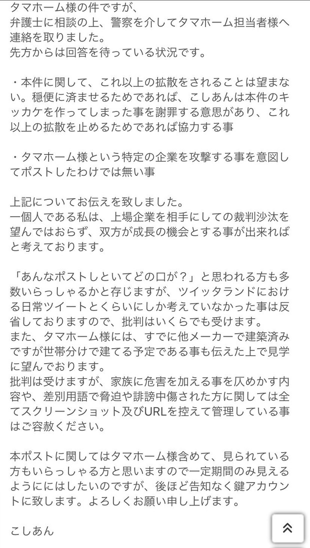 タマホーム社に訴えると名指しされていたこしあん氏、完全謝罪。