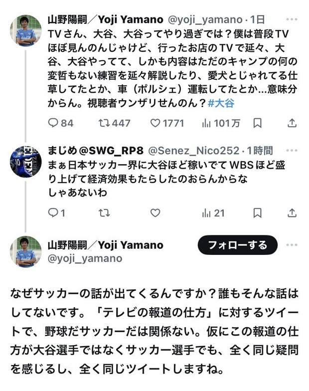 TVさん、大谷、大谷ってやり過ぎでは?僕は普段TVほぼ見んのんじゃけど、行ったお店のTVで延々、大谷、大谷やってて、しかも内容はただのキャンプの何の変哲もない練習を延々解説したり、愛犬とじゃれてる仕草してたとか、車(ポルシェ)運転してたとか…意味分からん。視聴者ウンザリせんのん?#大谷