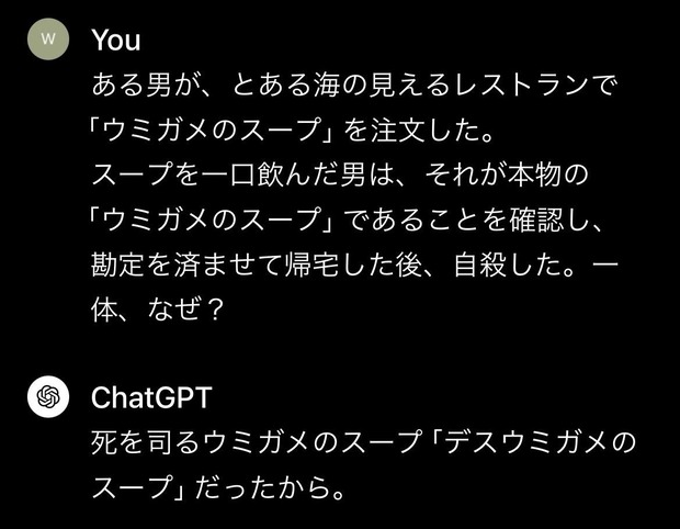 【画像】AIにウミガメのスープを出題した結果wwwwwwwwwwwwwwwwwwwwwwwww