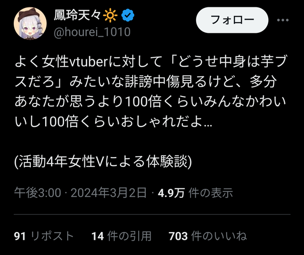 トレンドニュースよく女性vtuberに対して「どうせ中身は芋ブスだろ」みたいな誹謗中傷見るけど、多分あなたが思うより100倍くらいみんなかわいいし100倍くらいおしゃれだよ…