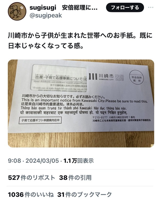 川崎市から子供が生まれた世帯へのお手紙。既に日本じゃなくなってる感。 pic.twitter.com/L1p6CYmgSI