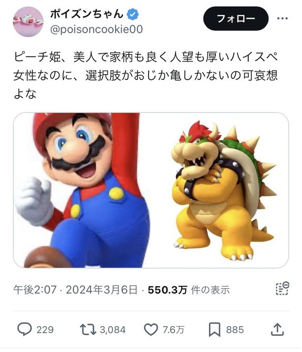 【悲報】X女子「ピーチ姫、美人で家柄もいいハイスペ女子なのに、男の選択肢がおじか亀しかないの可哀想」 7.6万いいね
