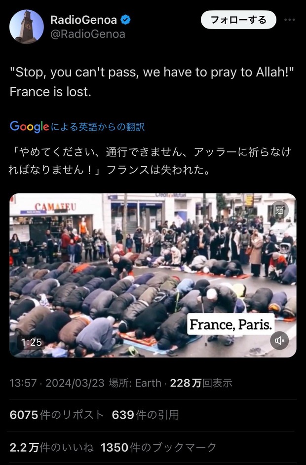 【動画】フランス人車列「どけっ!プップー(怒)」イスラム教徒「どきません!今からアラーに祈ります」