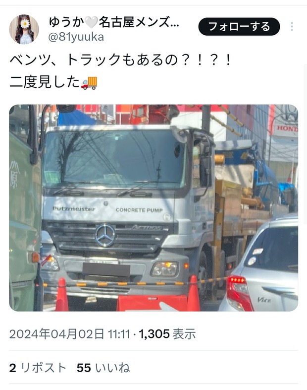 二度見した🚚 pic.twitter.com/NynZvBcldN— ゆうか🤍名古屋メンズエステ⋆⸜ 81 ⸝⋆ (@81yuuka) April 2, 2024