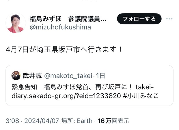 — 福島みずほ 参議院議員 社民党党首 (@mizuhofukushima) April 6, 2024