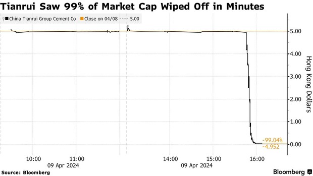 10日に香港株式市場で売買停止となった中国のセメントメーカー、中国天瑞集団水泥が注目が集まっている。同社株は9日、取引終了間際の15分間で急落し、時価総額のほぼ全てを失った。