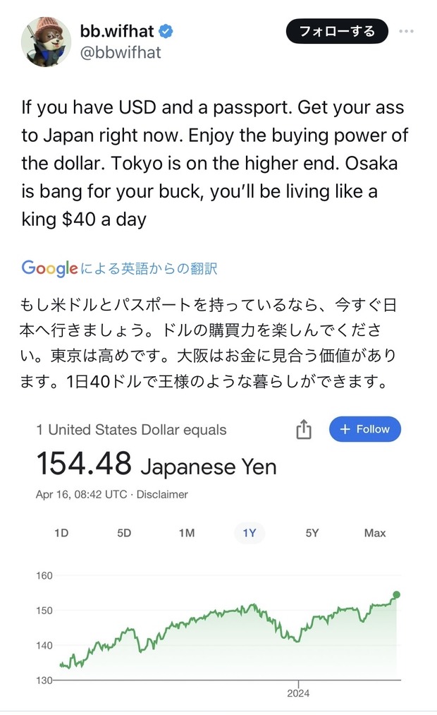 If you have USD and a passport. Get your ass to Japan right now. Enjoy the buying power of the dollar. Tokyo is on the higher end. Osaka is bang for your buck, you’ll be living like a king $40 a day pic.twitter.com/kx2mrqAZiq