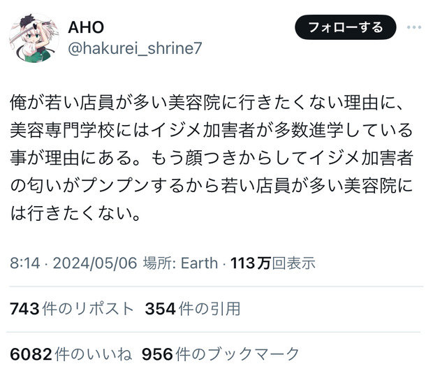 俺が若い店員が多い美容院に行きたくない理由に、美容専門学校にはイジメ加害者が多数進学している事が理由にある。もう顔つきからしてイジメ加害者の匂いがプンプンするから若い店員が多い美容院には行きたくない。