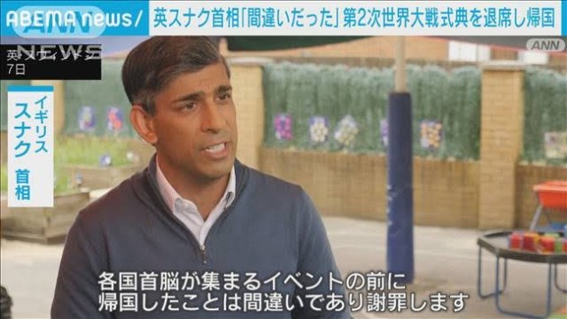イギリスのスナク首相が、総選挙に向けたインタビューのために第2次世界大戦の記念式典を途中退席したことについて、「間違いだった」と謝罪しました。