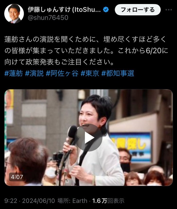 立憲民主党議員、蓮舫の演説動画を「#都知事選」ハッシュタグをつけて投稿 事前運動ではと話題