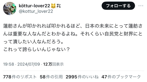 蓮舫さんが叩かれれば叩かれるほど、日本の未来にとって蓮舫さんは重要な人なんだとわかるよね。それくらい自民党と財界にとって潰したい人なんだろう。