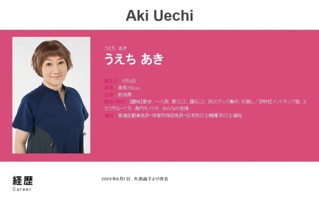『クレヨンしんちゃん』野原しんのすけ役を26年間務めた声優の矢島晶子が、8月より「うえち あき」に改名したことが、所属事務所アクロス エンタテインメントの公式サイトにて発表された。