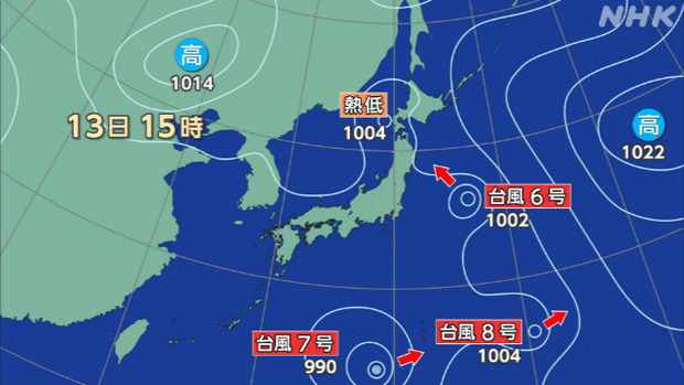 気象庁によりますと、ことし1月から先月までに発生した台風は4個でしたが、今月に入ると8日に台風5号、11日に6号、13日に7号、8号と立て続けに発生しています。