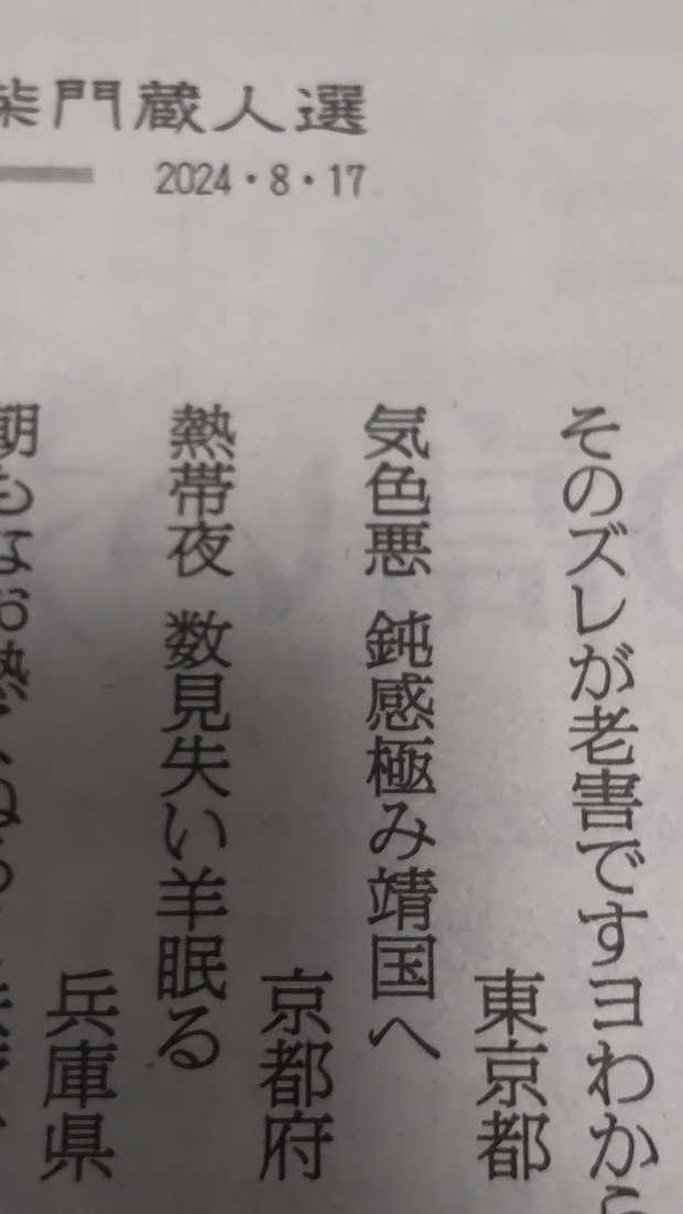 気色悪 鈍感極み靖国へ(京都府 岩川民子) 朝日川柳 柴門蔵人選:朝日新聞「破門だ」と池田大平宮沢氏(京都府 桑原宣彰) そのズレが老害ですヨわからんか(東京都 小山美王子) 気色悪 鈍感極み靖国へ(京都府 岩川民子) 熱帯夜 数見失い羊眠る(兵庫県 畠紀子) 朝もなお熱…
