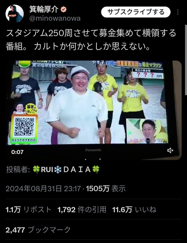 箕輪厚介「トラック250周走らせて募金集めて横領する24時間テレビ。カルトとしか思えない」
