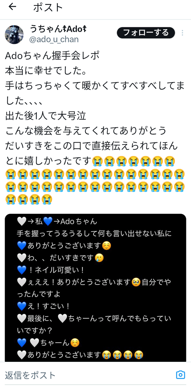 Ado握手会、1日目無事終了…ファン号泣「手はちっちゃくて暖かくてすべすべしてました」