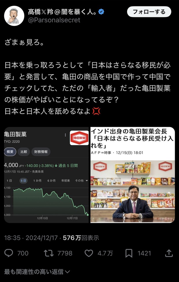 【悲報】亀田製菓会長が日本と日本人を舐めた結果、株価が"ヤバいこと"になってしまうwwwwwwwwwwwwww