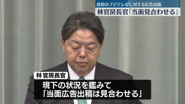 林官房長官は会見で政府のフジテレビに対する広告出稿について当面、見合わせる方針を明らかにしました。