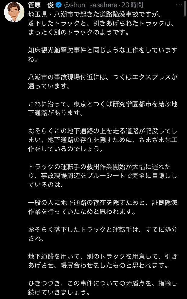 【悲報】Xの陰謀論者「陥没道路から引き上げられたトラックは転落したトラックと別物」