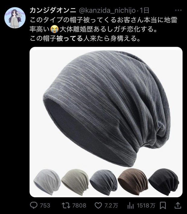 この帽子被ってる人来たら身構える。 pic.twitter.com/FSQhuonJlp— カンジダオンニ (@kanzida_nichijo) February 2, 2025