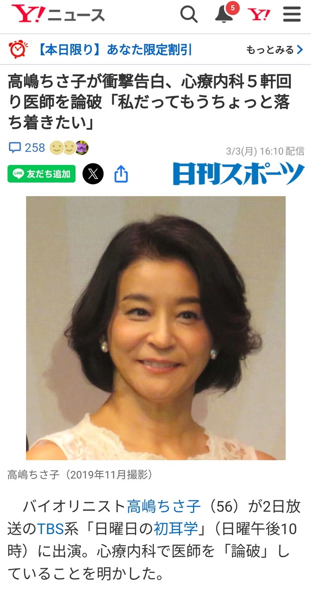 高嶋ちさ子さん「心療内科を5軒回り医師を論破してます」←マジモノ過ぎて界隈がざわめく