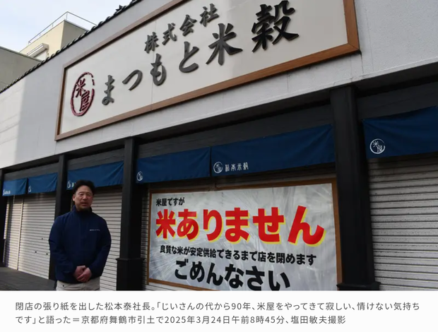 店先に掲げられた張り紙には、悔しさと心苦しさがにじむ。「米屋ですが、米ありません」。創業90年の老舗米穀店が24日、閉店した。仕入れ先から必要量の米を入荷することができなくなり、備蓄米を調達する見通しも立てられなかった。