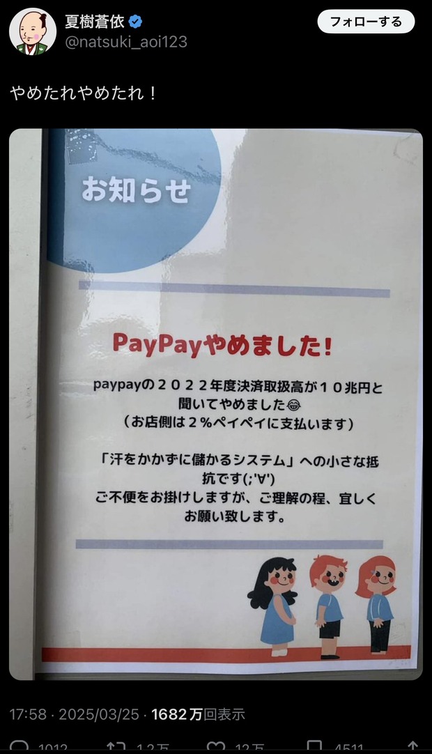 底辺小売「PayPayが取扱高20兆円で汗もかかず手数料2%チューチューしてるので辞めます」→12万いいねwww