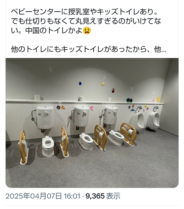 でも仕切りもなくて丸見えすぎるのがいけてない。中国のトイレかよ😫他のトイレにもキッズトイレがあったから、他に行ったほうがよいと思う。#万博 #テストラン pic.twitter.com/RyhRJ5BEpz