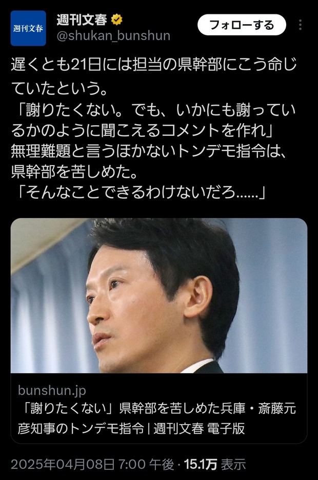 【悲報】斎藤元彦「謝りたくない!😡でもいかにも謝ってる風のコメント作れ」県職員「できるわけないだろ…😭」