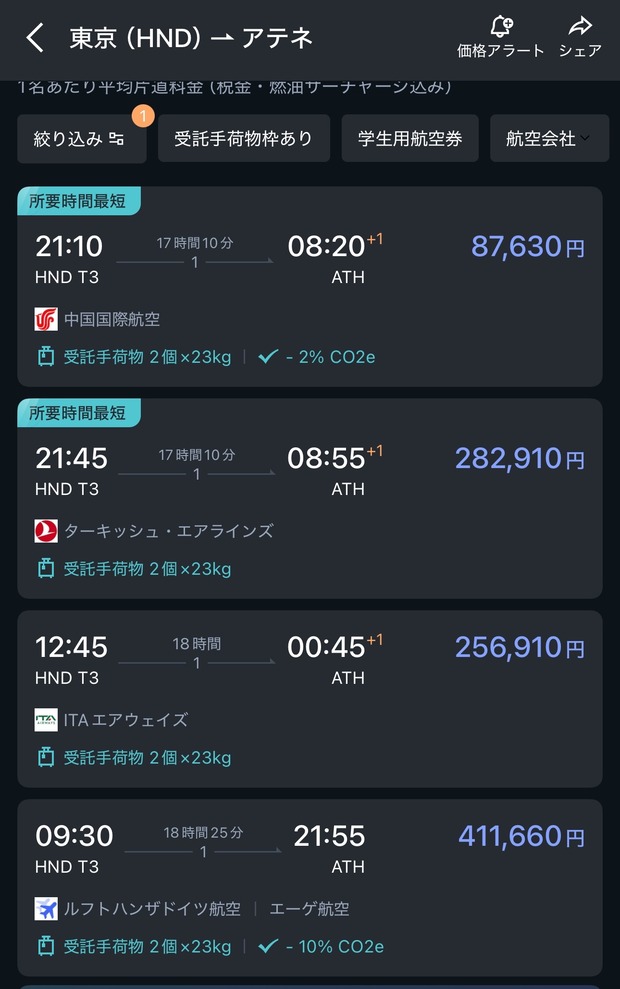 羽田からアテネが中国経由した方が他社より激安で行けてしまう…