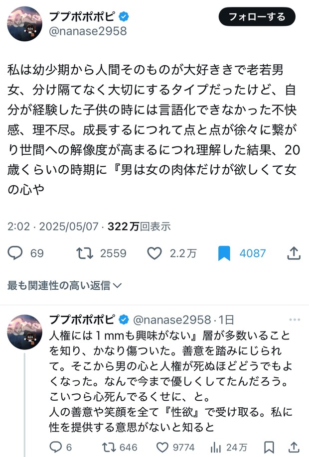 私は幼少期から人間そのものが大好ききで老若男女、分け隔てなく大切にするタイプだったけど、自分が経験した子供の時には言語化できなかった不快感、理不尽。成長するにつれて点と点が徐々に繋がり世間への解像度が高まるにつれ理解した結果、20歳くらいの時期に『男は女の肉体だけが欲しくて女の心や