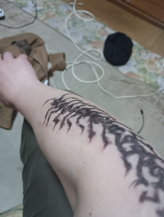 腕にムカデのタトゥーを自分で彫ってるけどダル過ぎて吐きそう