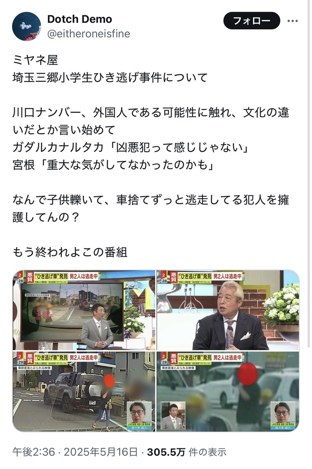 【正論】ミヤネ屋「小学生ひき逃げは文化の違いの可能性高い!ガタガタ騒ぐな!😤」