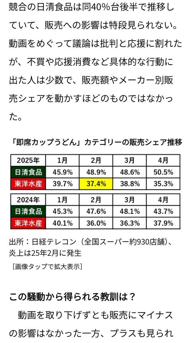 >不買や応援消費など具体的な行動に出た人は少数で、販売額やメーカー別販売シェアを動かすほどのものではなかった。