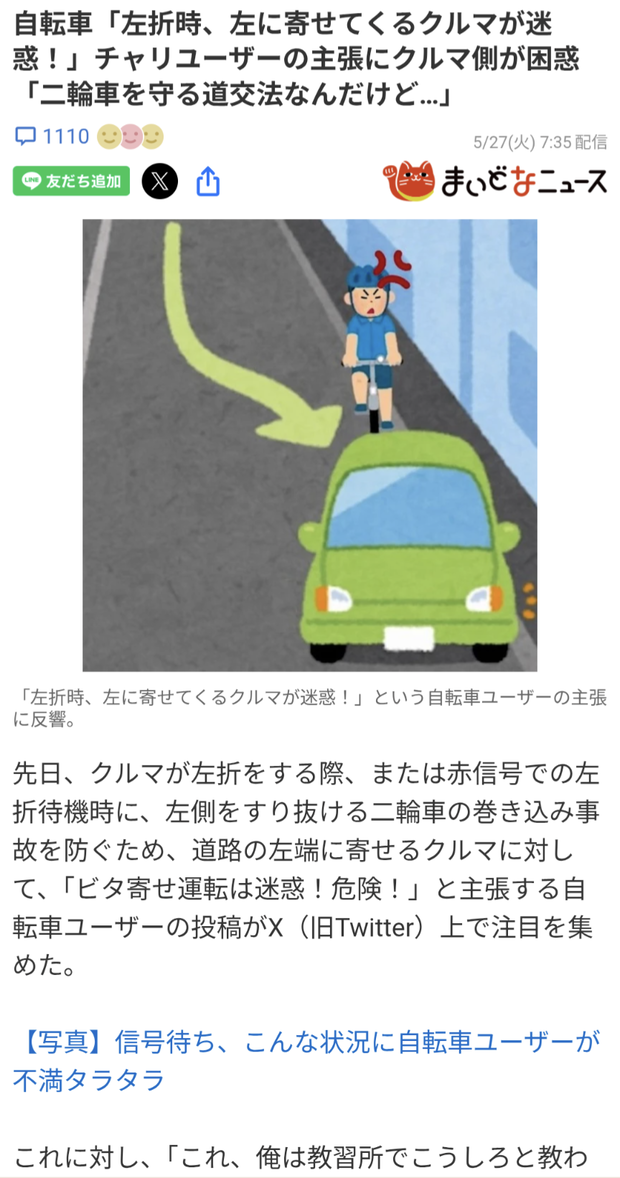 自転車乗りの77%「左折するとき左に寄せてくる車が迷惑やめてほしい」