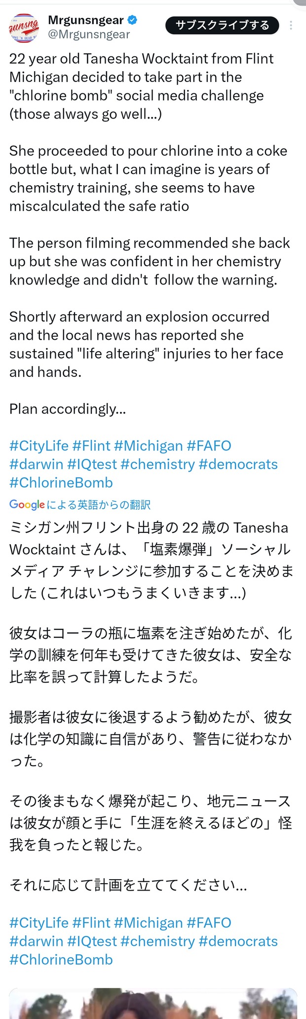 【動画】女さん、塩素爆弾チャレンジなるもので生涯を終えるほどの怪我をしてしまう…