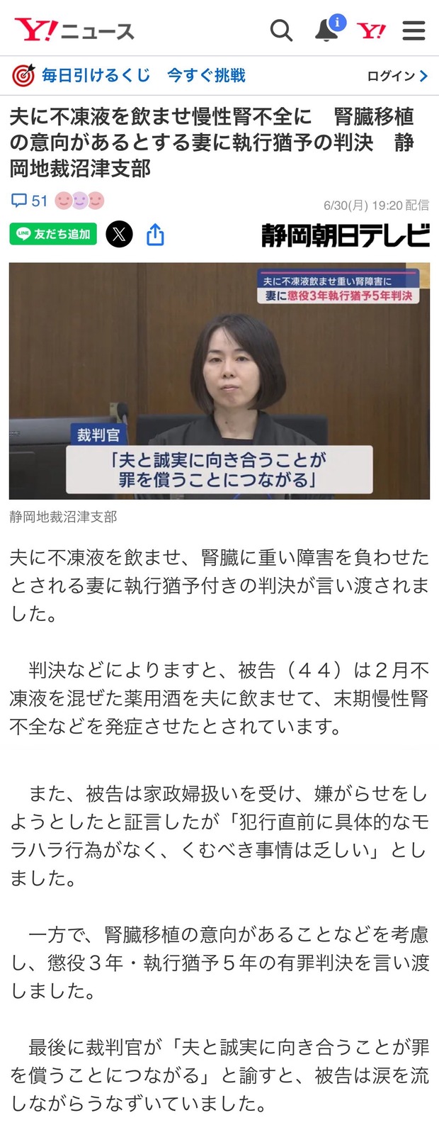 夫に不凍液を飲ませ慢性腎不全に 腎臓移植の意向があるとする妻に執行猶予の判決 静岡地裁沼津支部(静岡朝日テレビ) – Yahoo!ニュース