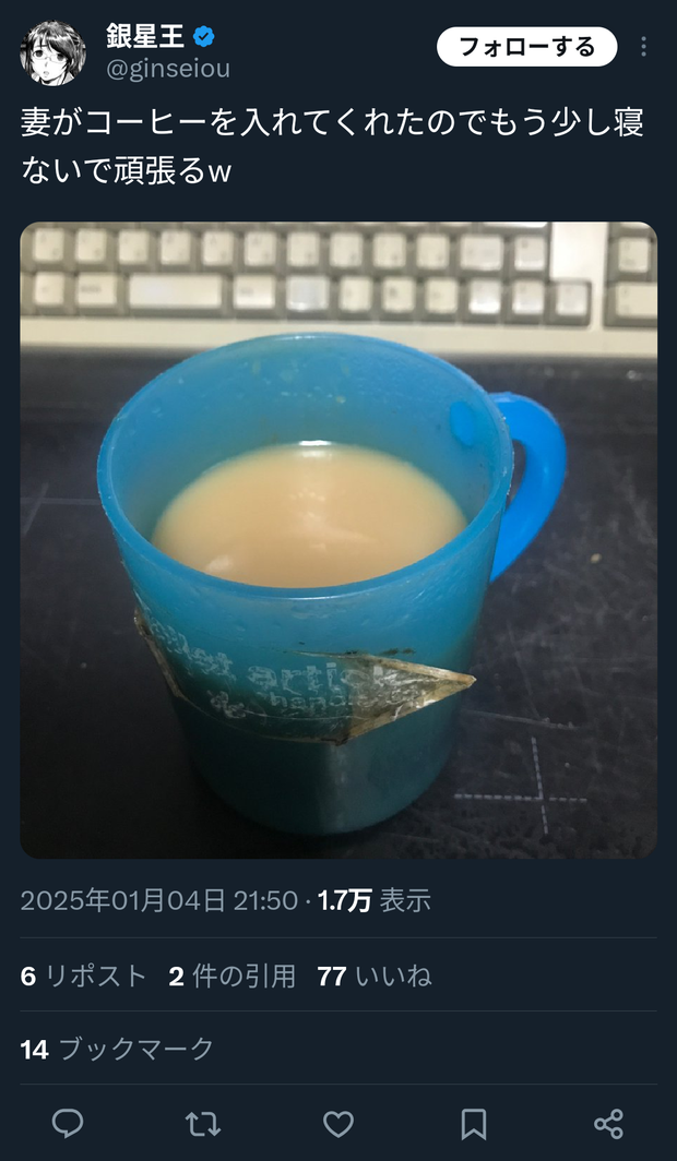 【画像】ツイッタラー「妻がコーヒーを入れてくれたのでもう少し寝ないで頑張るw」