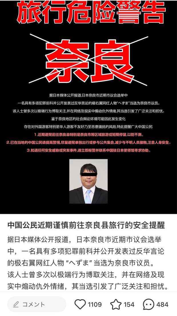日本のメディアの報道によると、先日行われた奈良市議会選挙で、複数の犯罪歴があり、公然と反中国的な発言を行っている極右ネット有名人「へずま」氏が奈良市議会議員に選出されました。この人物は、オンライン上および実生活において、過激な行動で繰り返し注目を集め、外国人嫌悪を煽ってきました。彼の当選は、広く懸念と不安を引き起こしています。