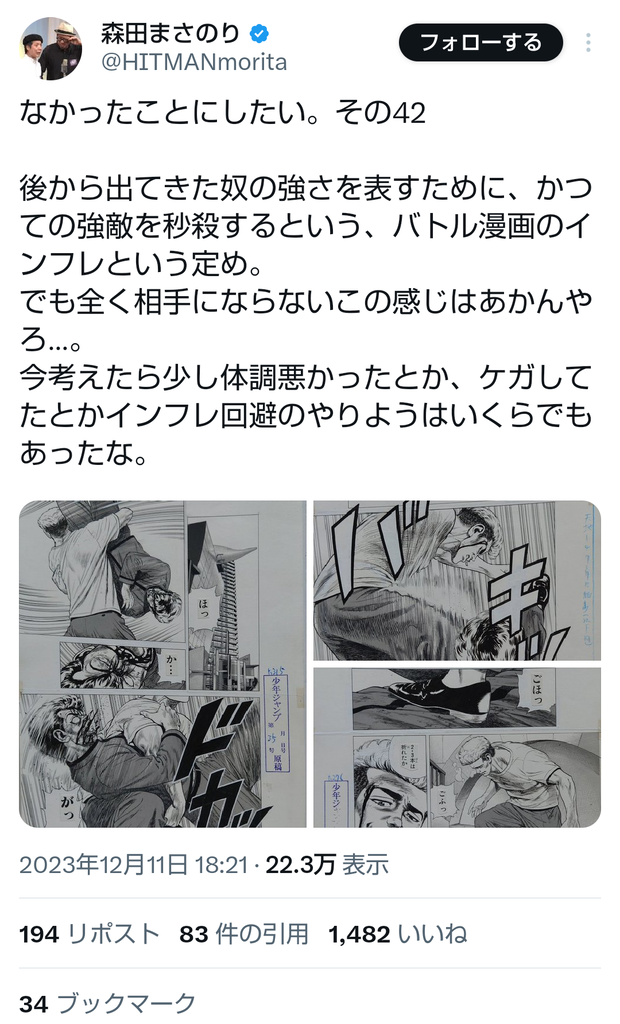 今考えたら少し体調悪かったとか、ケガしてたとかインフレ回避のやりようはいくらでもあったな。 pic.twitter.com/kqE2KZ3GNC— 森田まさのり (@HITMANmorita) December 11, 2023