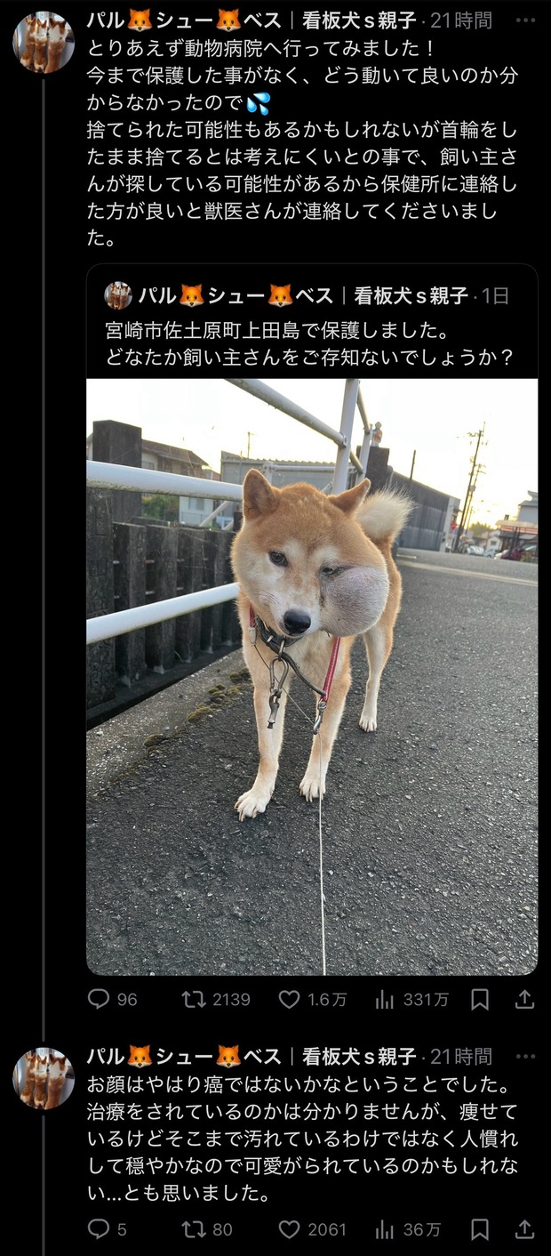 治療をされているのかは分かりませんが、痩せているけどそこまで汚れているわけではなく人慣れして穏やかなので可愛がられているのかもしれない…とも思いました。— パル🦊シュー🦊ベス|看板犬s親子 (@angenombril) August 2, 2025