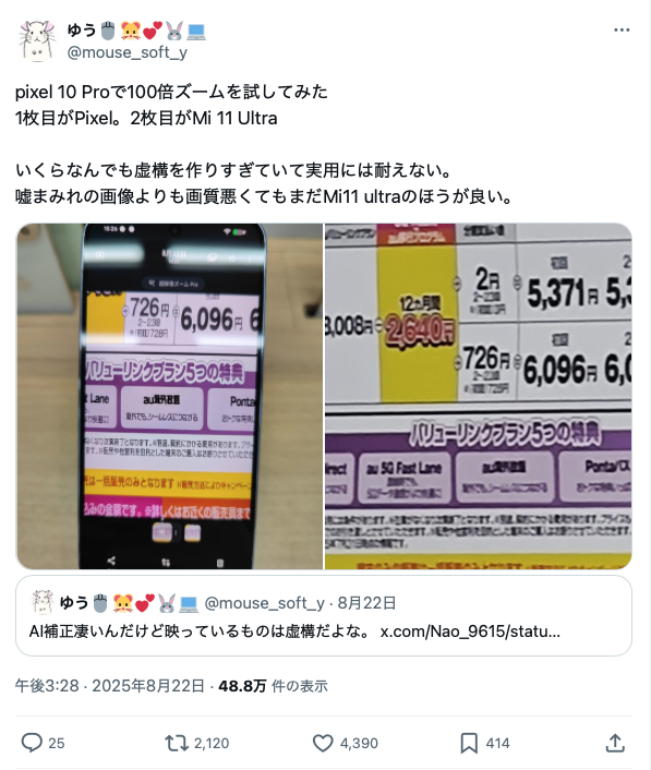 嘘まみれの画像よりも画質悪くてもまだMi11 ultraのほうが良い。 https://t.co/UMf9SN5MaE pic.twitter.com/AUVSPos7m1— ゆう🖱🐹💕🐰💻 (@mouse_soft_y) August 22, 2025