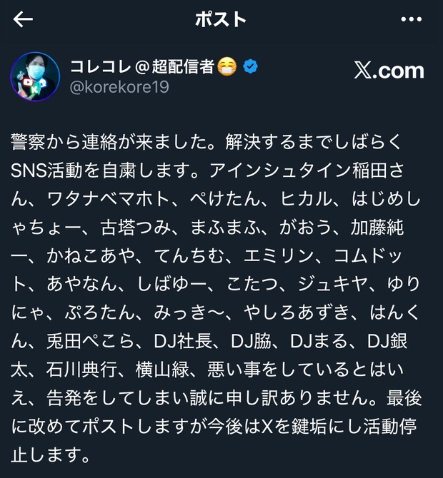 【記事全文】配信者・コレコレ SNS活動自粛を発表「警察から連絡が来ました」 アインシュタイン稲田への謝罪も – スポニチ Sponichi Annex 芸能