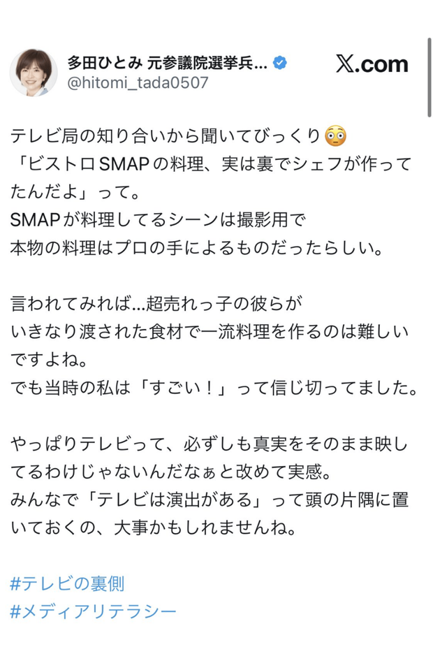 9月12日、国民民主党・兵庫県参議院支部長の多田ひとみ氏がSNS上で投稿した“問題提起”が大きな物議を醸している。フジテレビの人気番組『SMAP×SMAP』内のコーナー「ビストロSMAP」について、料理の裏側を暴露するような内容を投稿したところ、SMAPファンを中心に激しい批判を浴び、投稿を削除して謝罪する事態に発展した─。