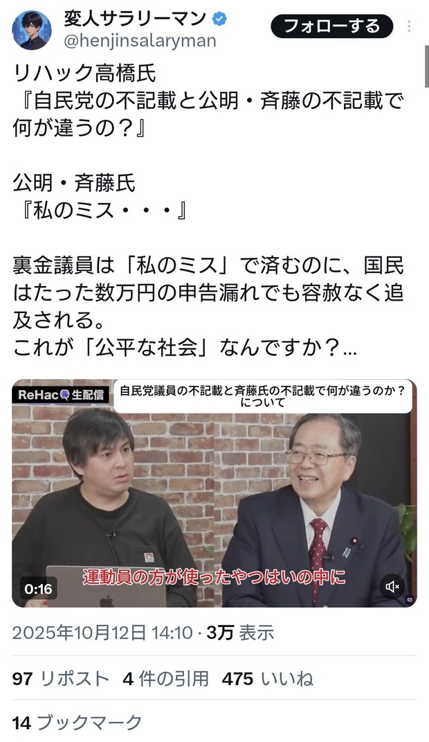 これが「公平な社会」なんですか?… pic.twitter.com/u5Mjn5roKC— 変人サラリーマン (@henjinsalaryman) October 12, 2025