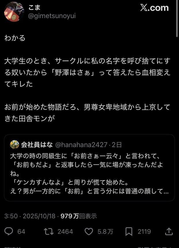 お前が始めた物語だろ、男尊女卑地域から上京してきた田舎モンが https://t.co/3Vh3SNdna9