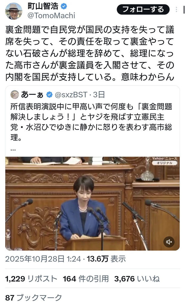 町山智浩氏「裏金問題で国民の支持を失ったのに国民は高市内閣を支持している。意味わからん」